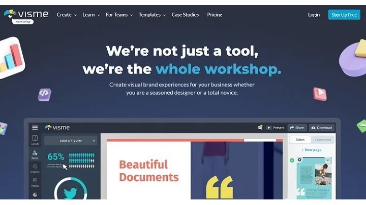 Overview: Visme's app designs animated infographics with presentation tools and stock videos.